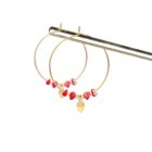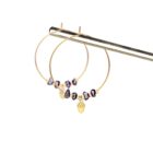 •  Créoles de 3 cm de diamètre et breloques en laiton doré à l’or fin, accompagnées de véritables pierres fines et de perles en laiton dorées à l’or fin