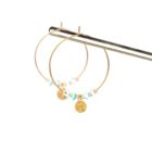 - Créoles de 3 cm de diamètre et breloques en laiton doré à l’or fin, accompagnées de véritables pierres fines et de perles en laiton dorées à l’or fin