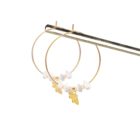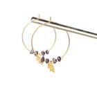 •  Créoles de 3 cm de diamètre et breloques en laiton doré à l’or fin, accompagnées de véritables pierres fines et de perles en laiton dorées à l’or fin