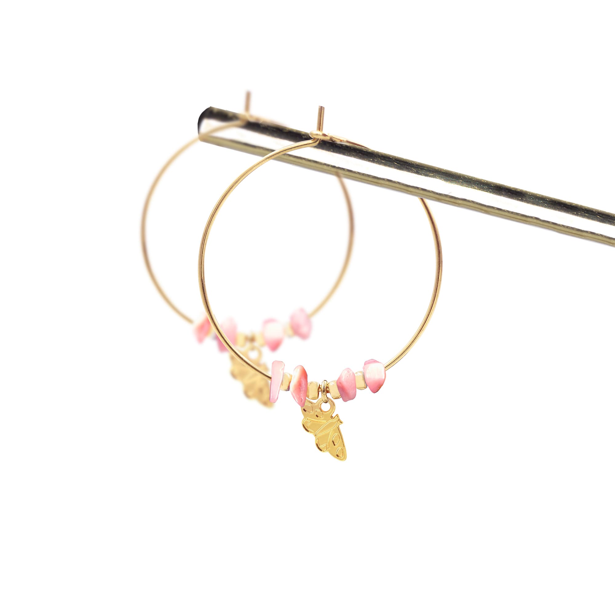 •  Créoles de 3 cm de diamètre et breloques en laiton doré à l’or fin, accompagnées de véritables pierres fines et de perles en laiton dorées à l’or fin