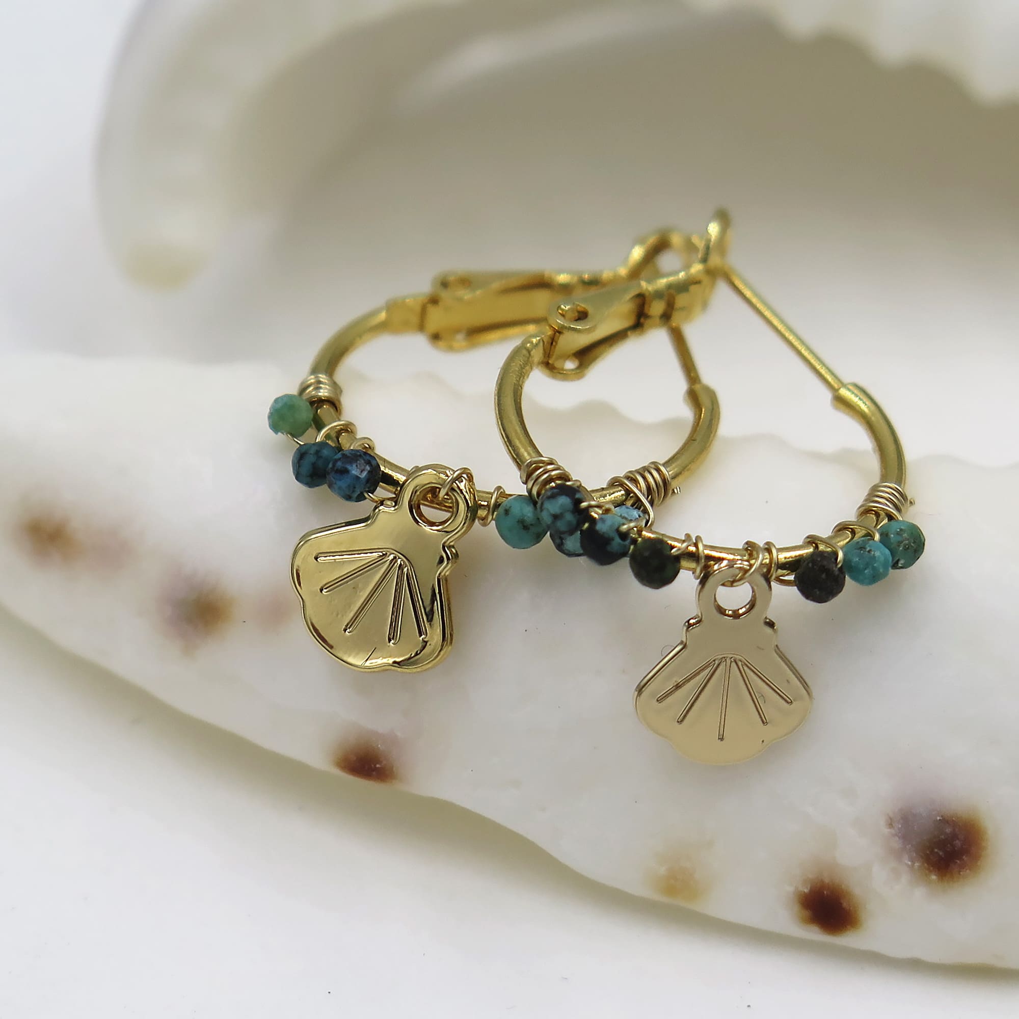 •  Créoles de 1,8 cm de diamètre et breloques en laiton doré à l’or fin, accompagnées de véritables pierres fines