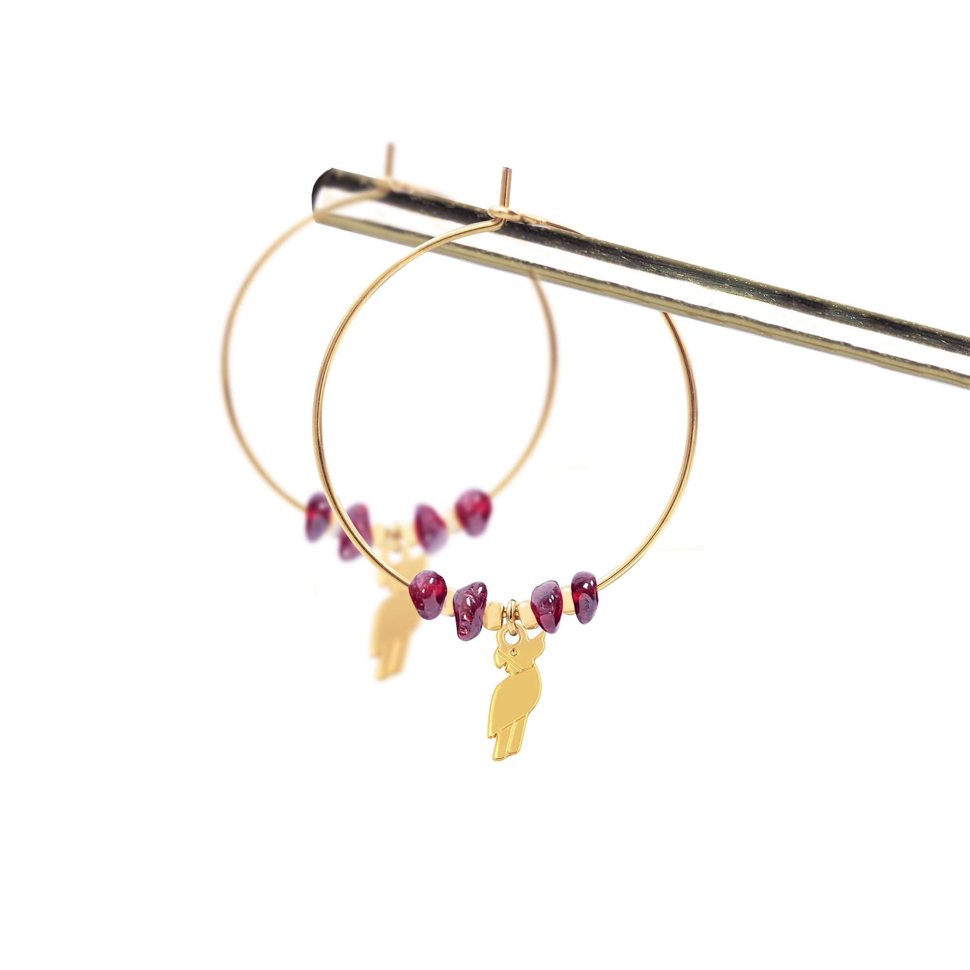 •  Créoles de 3 cm de diamètre et breloques en laiton doré à l’or fin, accompagnées de véritables pierres fines et de perles en laiton dorées à l’or fin