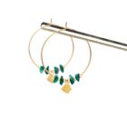 •  Créoles de 3 cm de diamètre et breloques en laiton doré à l’or fin, accompagnées de véritables pierres fines et de perles en laiton dorées à l’or fin