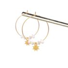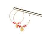 •  Créoles de 3 cm de diamètre et breloques en laiton doré à l’or fin, accompagnées de véritables pierres fines et de perles en laiton dorées à l’or fin