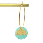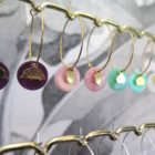 • Créoles de 3 cm de diamètre et breloques en laiton doré à l’or fin, accompagnées de nacres émaillées et de perles en laiton dorées à l’or fin