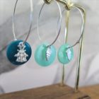 • Créoles de 3 cm de diamètre et breloques en laiton doré à l’or fin, accompagnées de nacres émaillées et de perles en laiton dorées à l’or fin