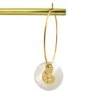 • Créoles de 3 cm de diamètre et breloques en laiton doré à l’or fin, accompagnées de nacres émaillées et de perles en laiton dorées à l’or fin