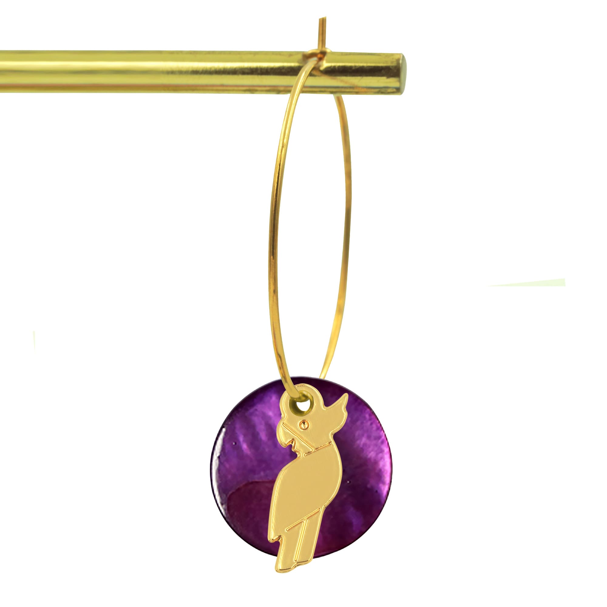 - Créoles de 3 cm de diamètre et breloques en laiton doré à l’or fin, accompagnées de nacres émaillées et de perles en laiton dorées à l’or fin