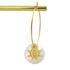 - Créoles de 3 cm de diamètre et breloques en laiton doré à l’or fin, accompagnées de nacres émaillées et de perles en laiton dorées à l’or fin